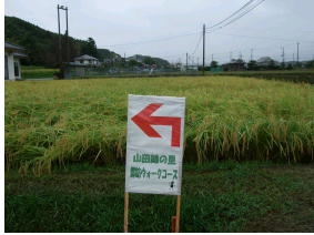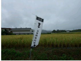 田んぼには山田錦契約田の旗が随 所に立てかけられていた |