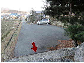 河内ふれあいの森」案内板が見えたので左折し細い道を進むと六處神社の鳥居前の駐車場に着いた。