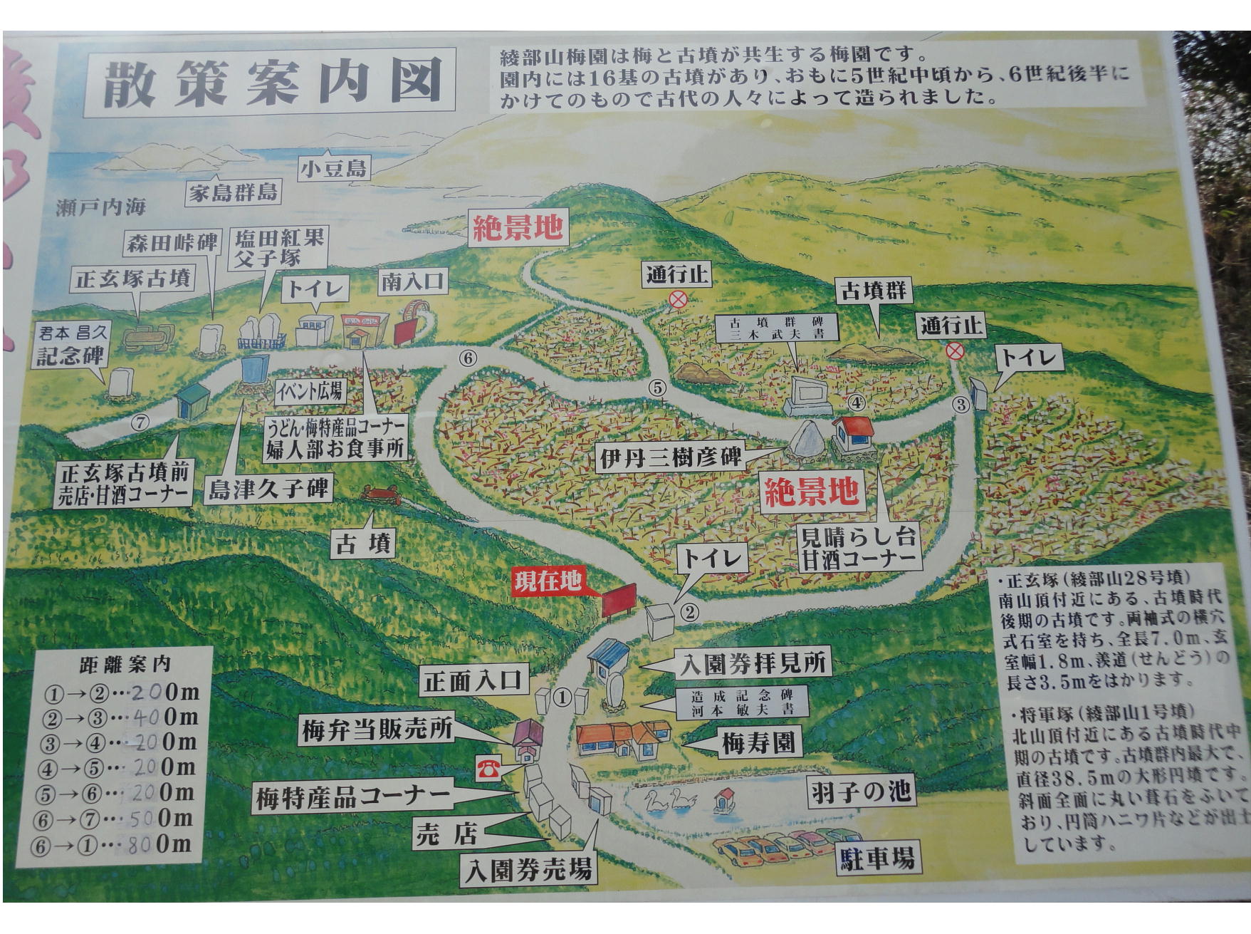 南入口13:10〜 (綾部山梅林散策) 〜  世界の梅公園入口14:10→  綾部山(登り岩)14:25〜14:30→  (世界の梅公