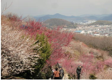 綾部山梅林の最上部に到着した             綾部山梅林の最上部からの眺望