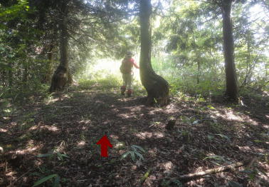 作業道に添って倒れている倒木 |