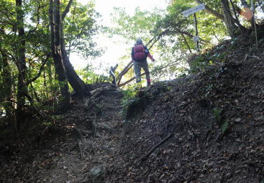 中道の滑り易い登山道を下る |