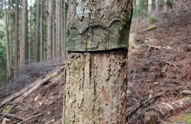 林道終点に金香瀬山登山道の案内板○内が見えたのでここから山中に入る |
