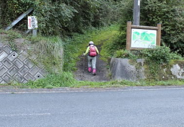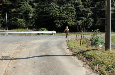 展望のない尾根道の僅かな隙間から棚田を見る |
