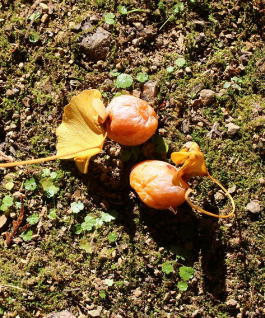 2018年11月23日(金)晴後曇り 駐車地点10:35→ 権現池口10:40→ お葉付きイチョウ(庚申堂)10:55〜11:05→ 参道口11:15→ 駐車地点11:22 ハイキング目次へ / ブログへ 加西市殿原のお葉付きイチョウが色づいている頃だろうと見物に出かけた。駐車場がなく墓地前スペースに停めた。