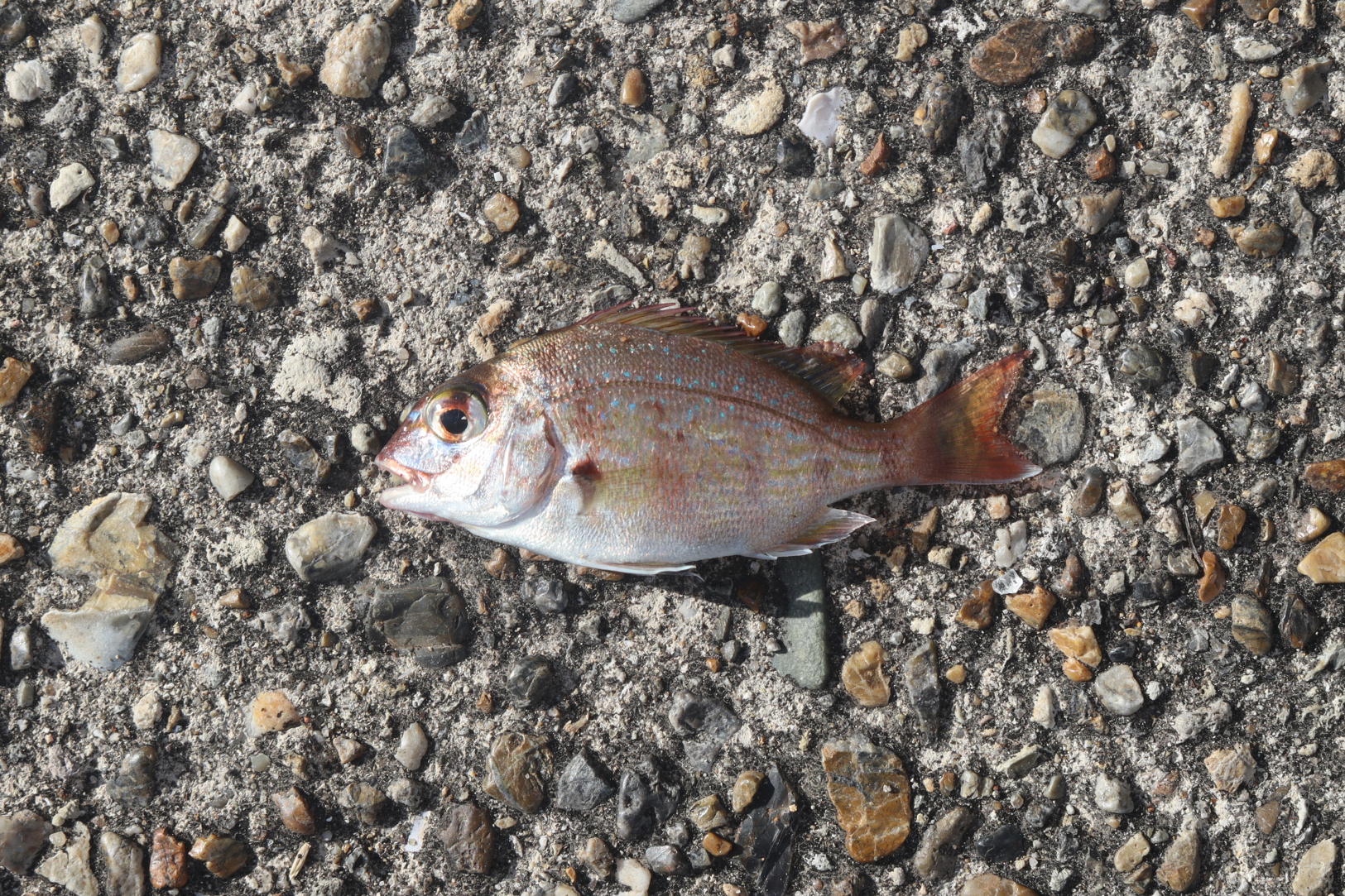 庫に眠っていたオキアミ、オキアミでは数秒で素バリになります。根気よく竿を打ち返すと青ベラが釣れました。エ