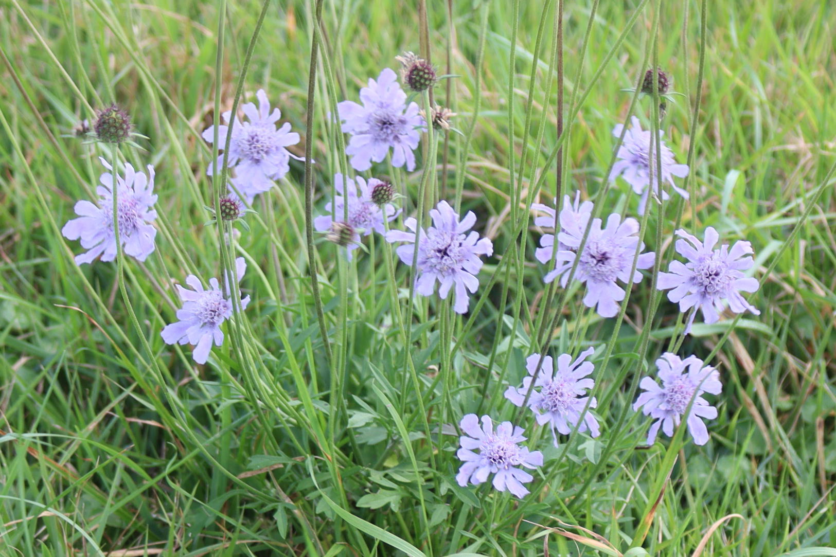 と気温は19℃、風が強く寒いのでカッパを着てスタートです。歩き始めてすぐにマツムシソウがいっぱい咲いていま