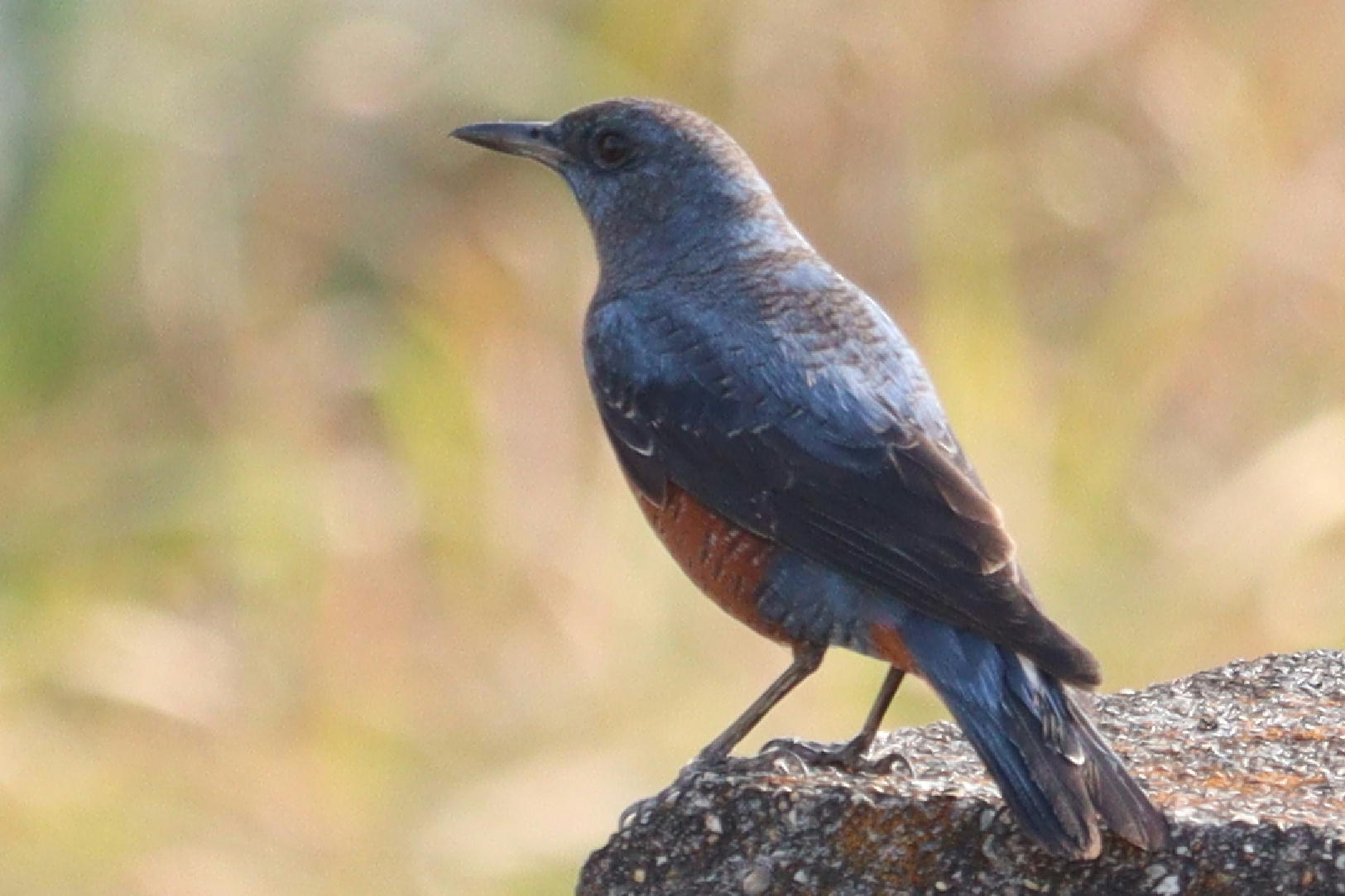 今日のイソヒヨドリは雄、背中が深い青色、腹は赤茶色、縄張り争いをよくしています
