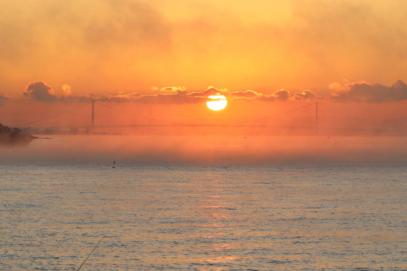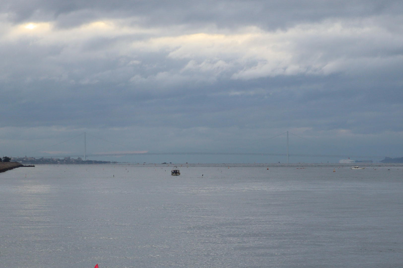 明石海峡大橋の真上に登る朝日は雲に覆われ残念ながら見えず