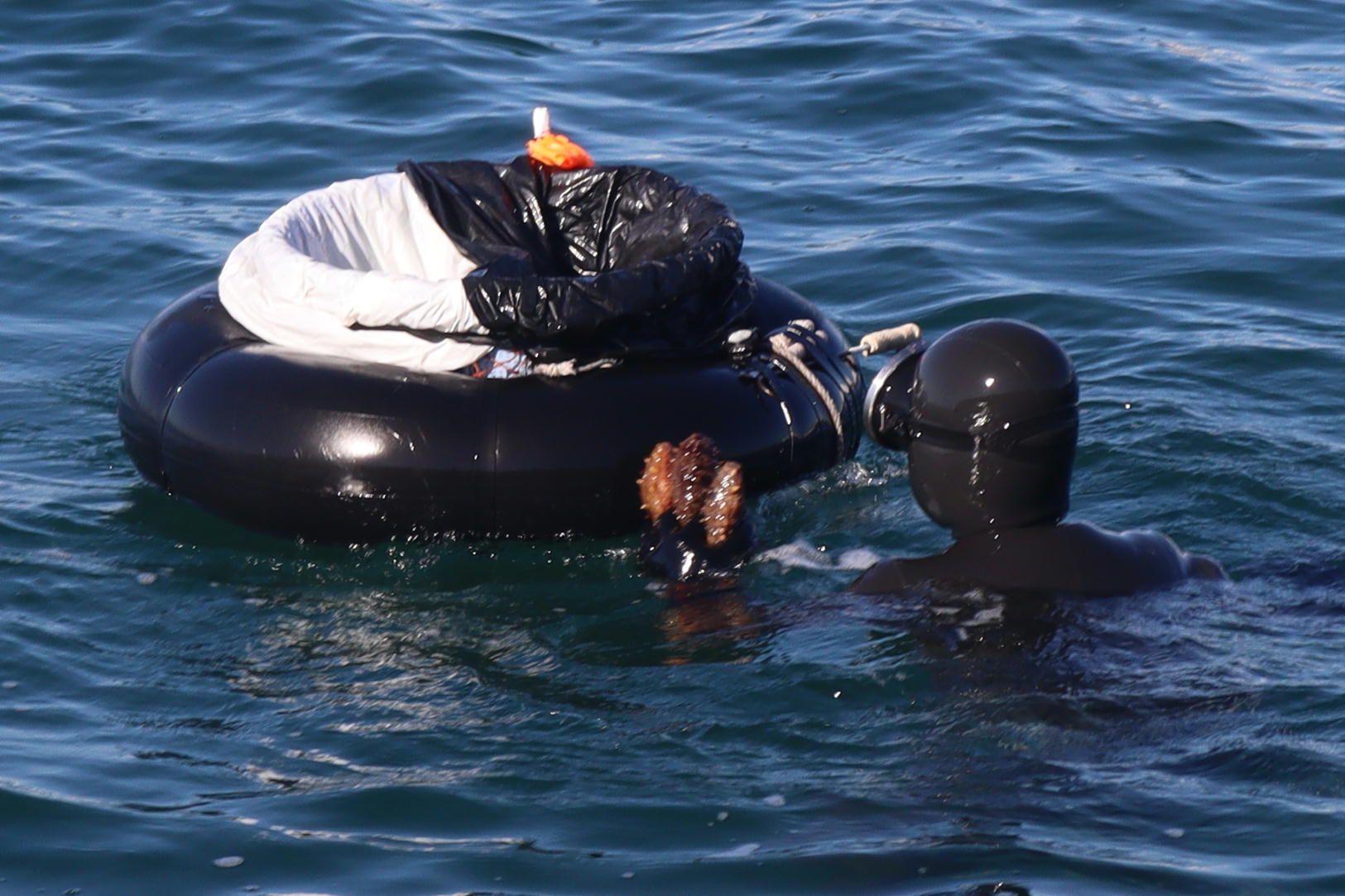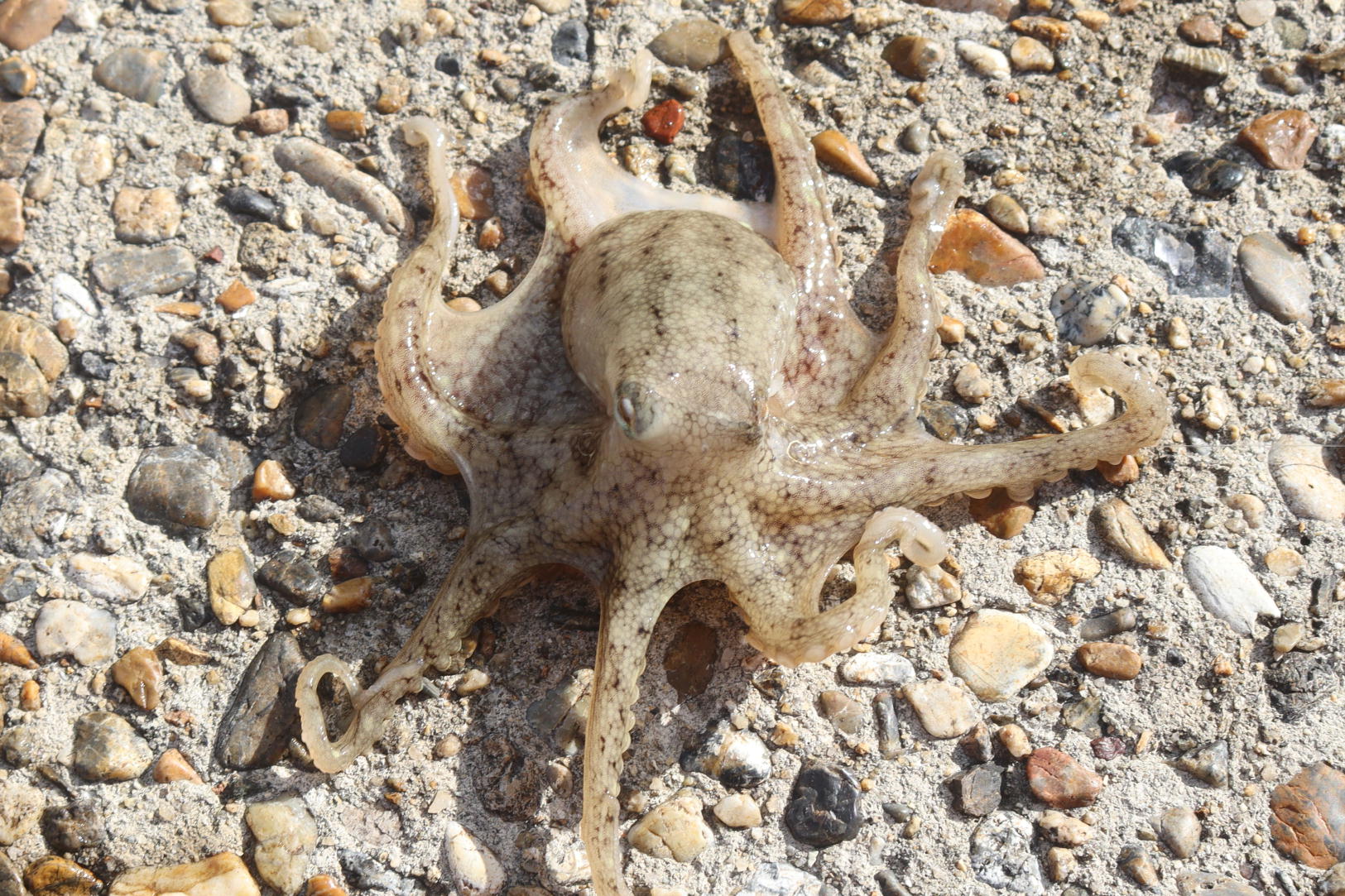ナマコの潜り漁の始まり、中央の手に持つ赤(3個)がナマコ
