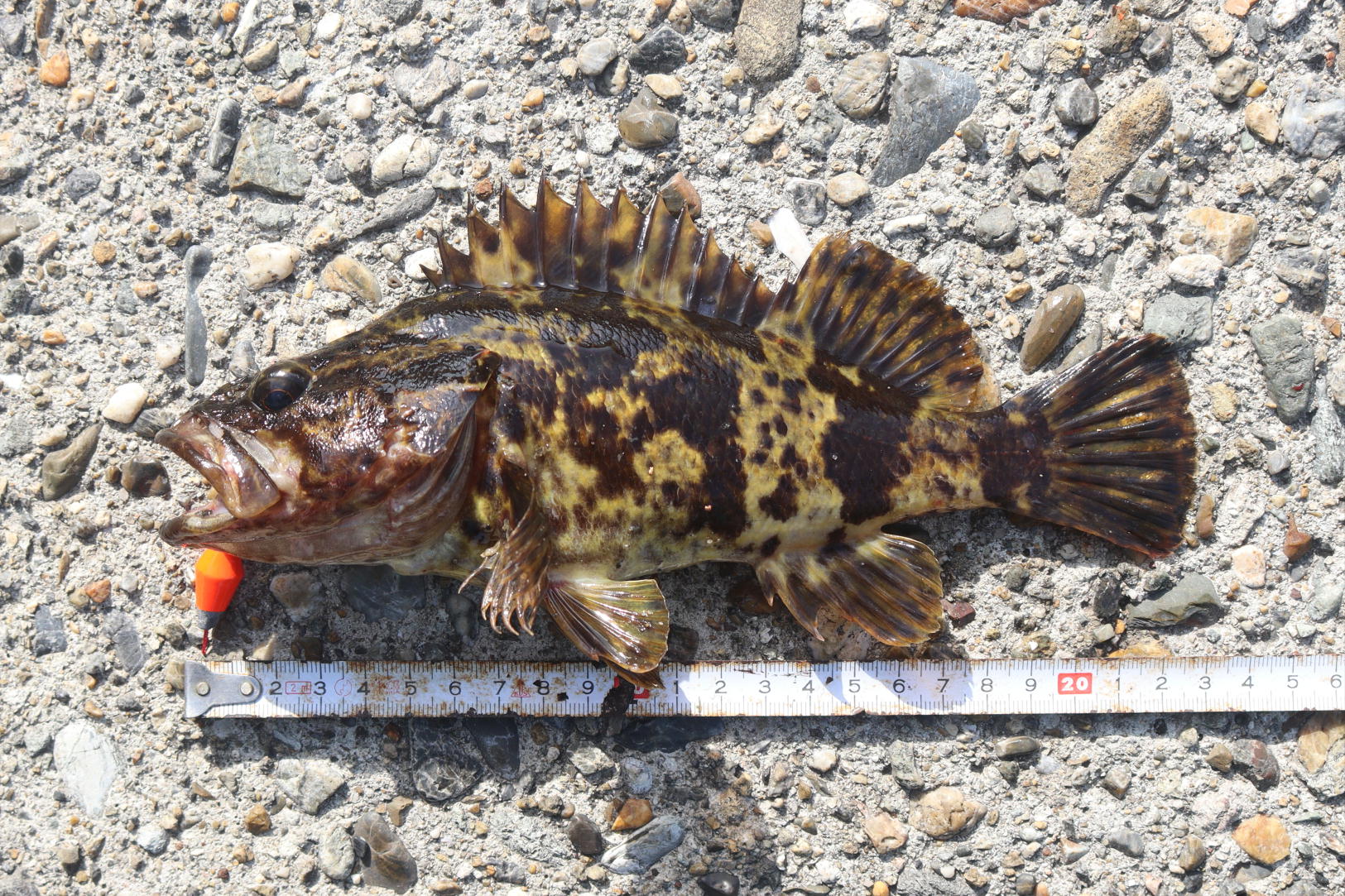 上げると大暴れ、何が釣れたのかわかりませんがテトラの上でがっちりと掴みました。ガシラではなく模様のある23