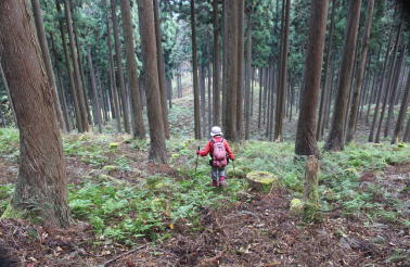 昼食中に小雨が降ったが杉木の下は傘いらず、雨はすぐに止んだ、下山は大森神社方面へ |