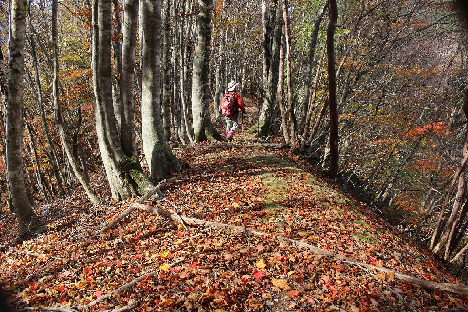 ミズナラも黄葉から紅葉、写真を撮っているとなかなか進まない |