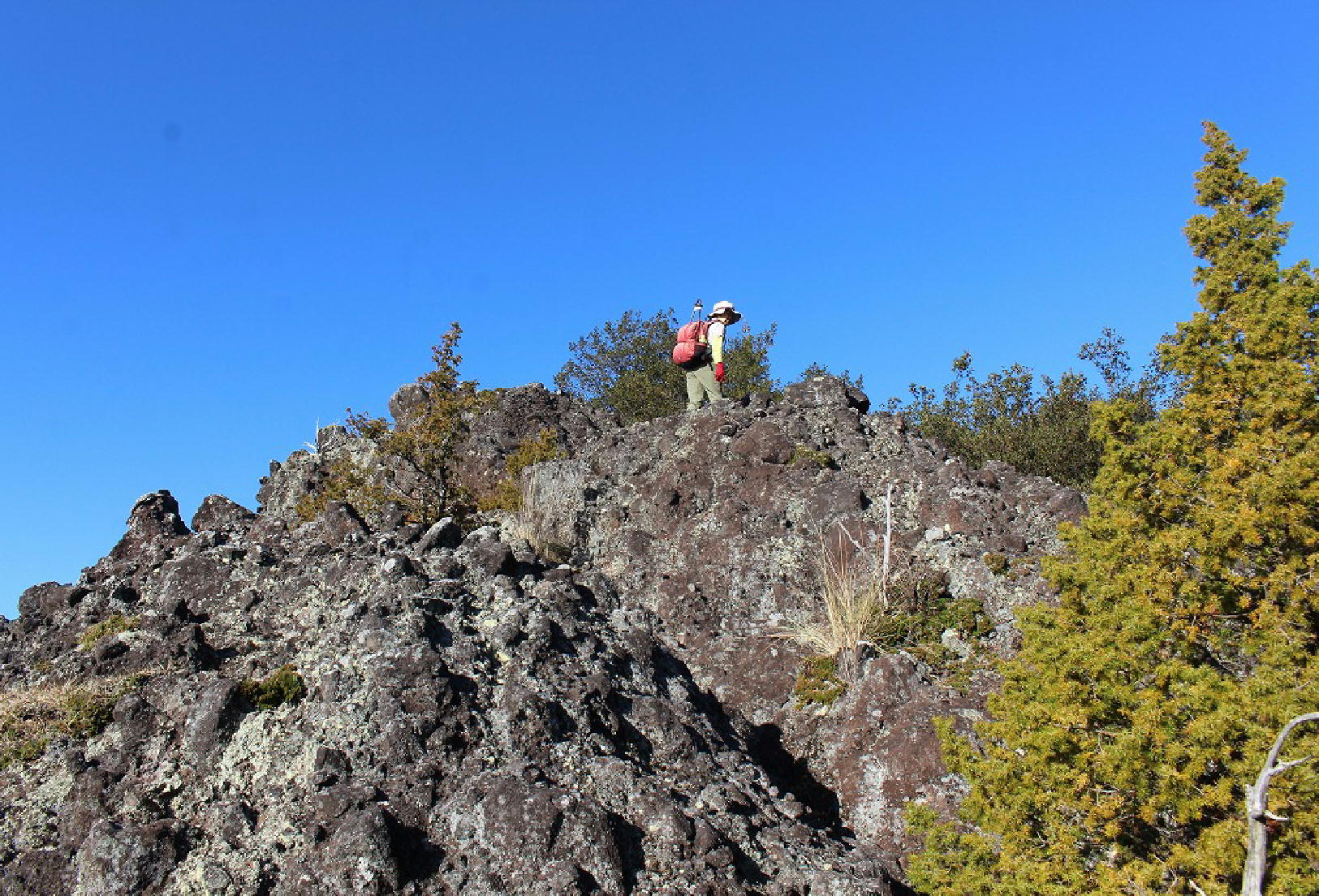 イワヒバが張り付く岩尾根から左上に尖がった岩が見えるがあそこまで行くのかな! |