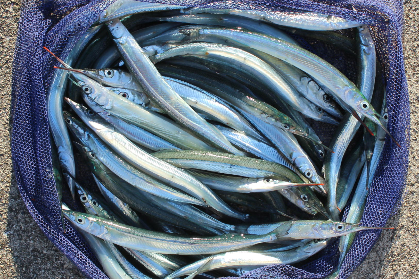 と重量感ある良型サヨリが釣れました。その後も順調に釣れ続きます。サヨリは撒き餌がなくなるとすぐにいなくな