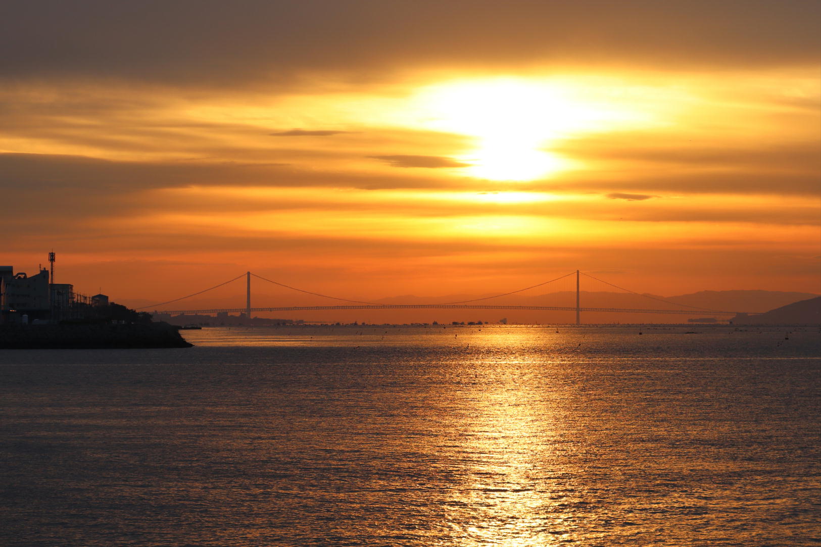 明石海峡大橋の真上に登る朝日は雲に覆われ残念ながら見えず