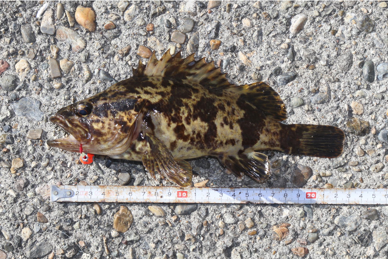 上げると大暴れ、何が釣れたのかわかりませんがテトラの上でがっちりと掴みました。ガシラではなく模様のある23