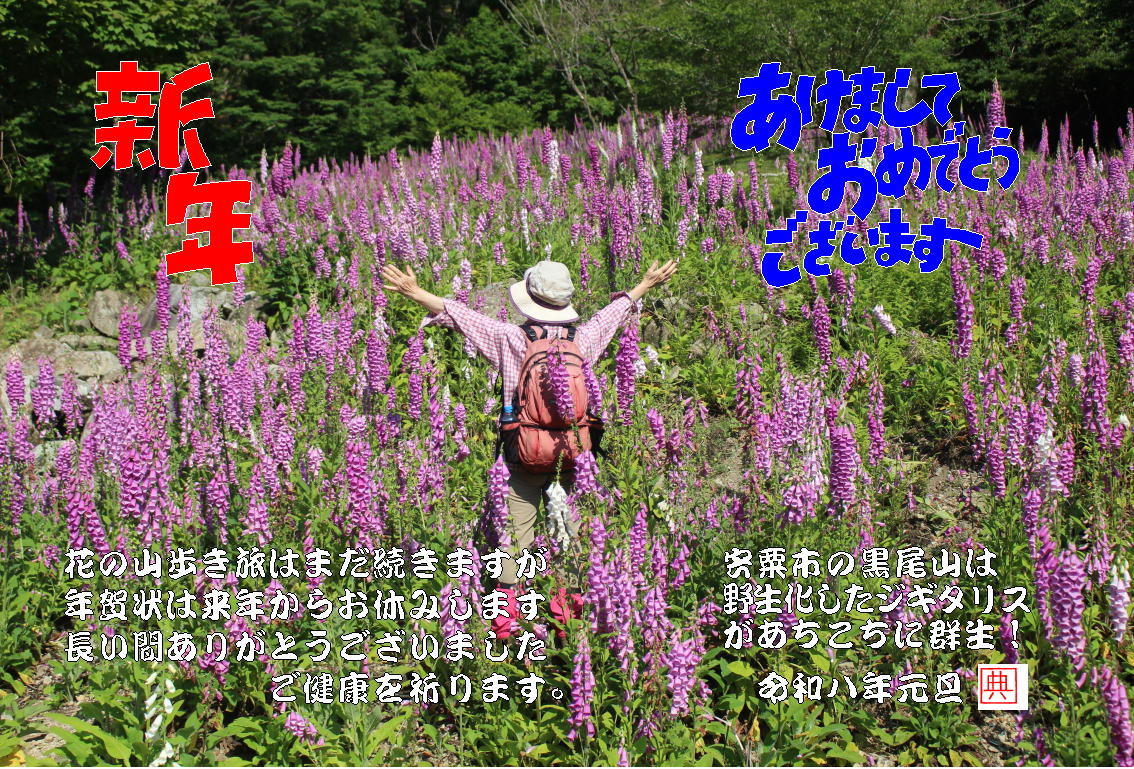 今年の年賀状は花めぐりの山旅、宍粟市の黒尾山の野生化したジギタリス群生地です。
